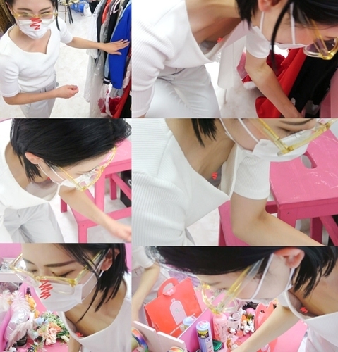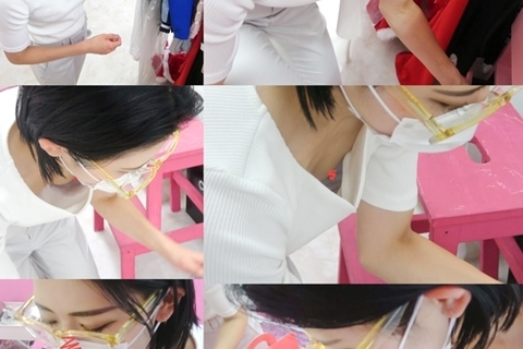 スリッパ対応はなかったけど、アルコール消毒を勧められて、いきなりガバ開き胸チラ!!
