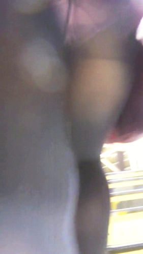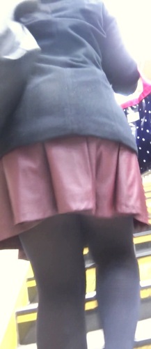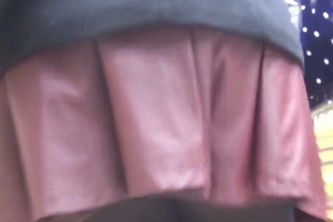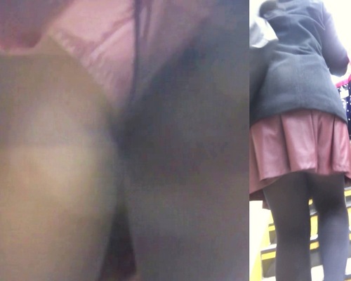 彼女は赤紫色のミニスカートを履いていました。レザーっぽい生地のスカートに見えたので、裾がヒラヒラしてカメラを差し込みやすそうです。そこでカメラを準備して撮影を開始しました。