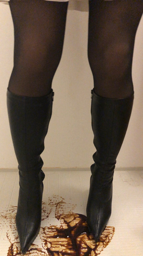 お風呂場でロングブーツを履いてチョコレートソースで遊んでみました。
