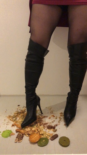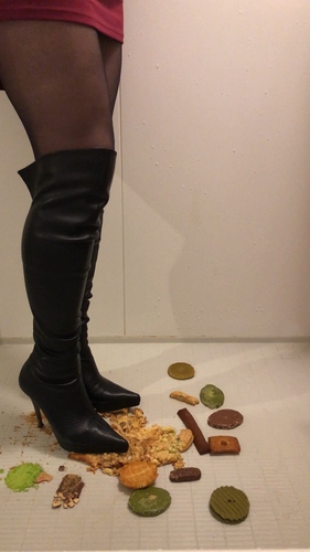 ピンヒールのニーハイブーツでカラフルな洋菓子を踏み踏みしてみました