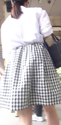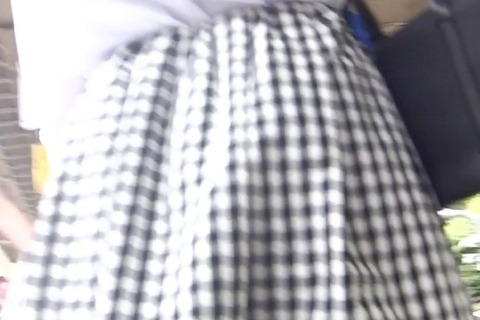 彼女は白黒のチェック柄ミニスカートを履いていました。プリーツが弱めのスカートだったので、カメラをスカートの中へ差し込みやすそうです。そこでカメラを準備して撮影を開始です。彼女を追いかけていきます。