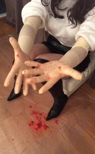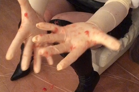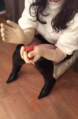 ニーハイブーツ、ゴム手袋でトマトを握り潰し