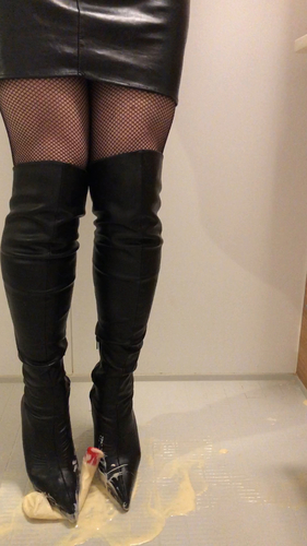 レザースカート、編タイツにお気に入りのピンヒールのニーハイブーツを履いて、マヨネーズを踏んでみました。