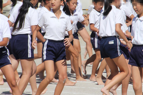 オーソドックスな紺短パンにチャック付きシャツが組み合わさる感じ。