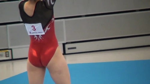 赤レオタチーム、紺色レオタチームのそれぞれの団体戦床運動、平均台の練習、競技の様子です。
