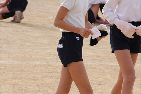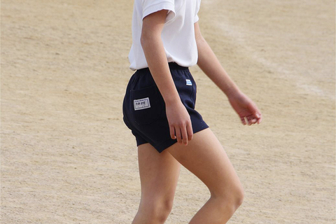 独特な制服を脱ぎ捨て短パン姿に着替え
