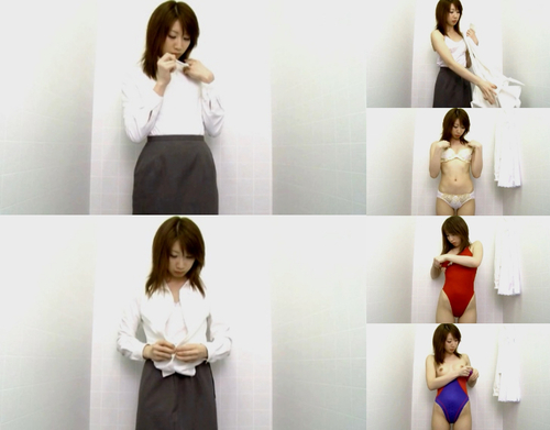 水泳教室に通う女の子達は体型に合うお好みの競泳水着を探し、いくつか選んでは試着室でお着替え。下着も脱いで全裸姿が丸見え。