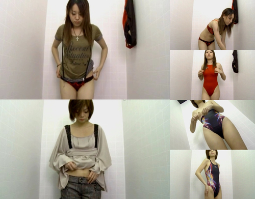 水泳教室に通う女の子達は体型に合うお好みの競泳水着を探し、いくつか選んでは試着室でお着替え。下着も脱いで全裸姿が丸見え。