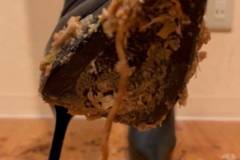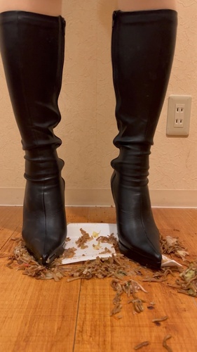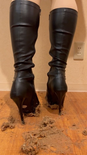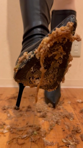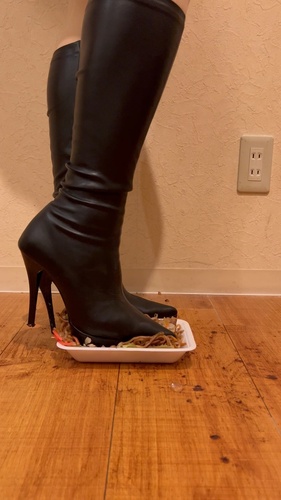 お気に入りのピンヒールのロングブーツで焼きそばをクラッシュしました