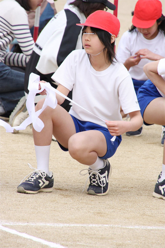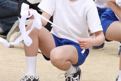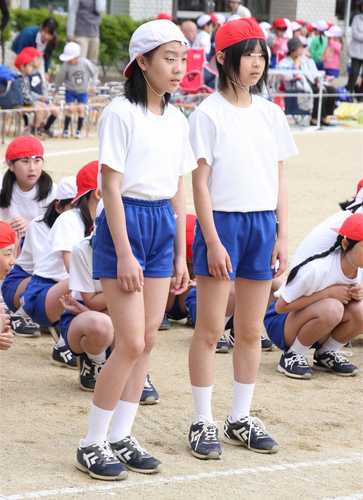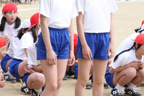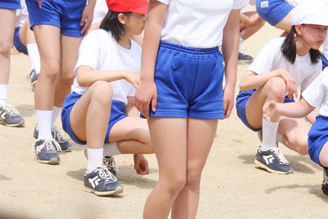 シンプルな白一色の体操着に青一色の短パンの組み合わせ。