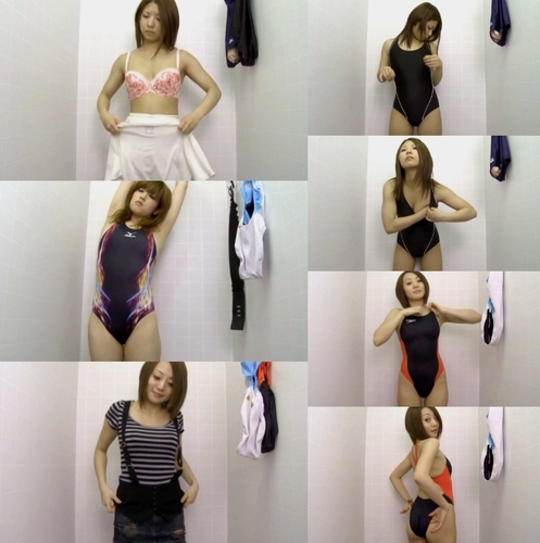 水泳教室に通う女の子達は体型に合うお好みの競泳水着を探し、いくつか選んでは試着室でお着替え。下着も脱いで全裸姿が丸見え。