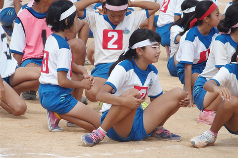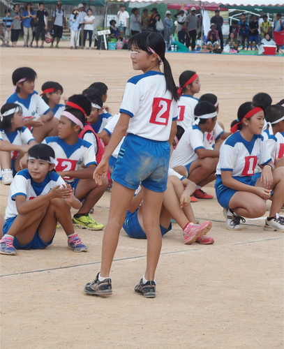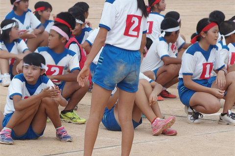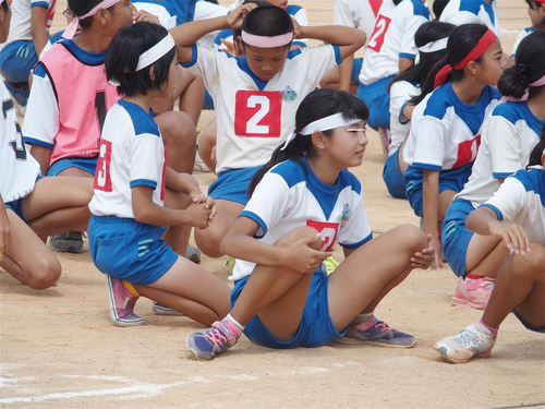 徒競走の続き。赤白帽非着用、ハチマキ姿なので