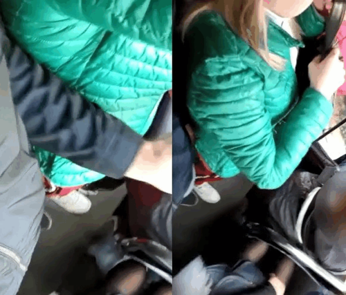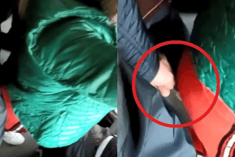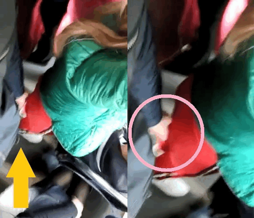 右手はつり革に、そして何も掴んでいない左手でおもむろに女性のお尻を掴みにいきます。