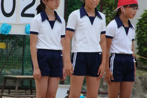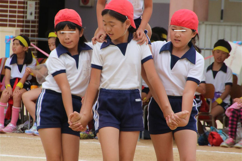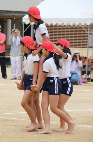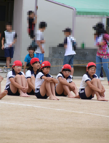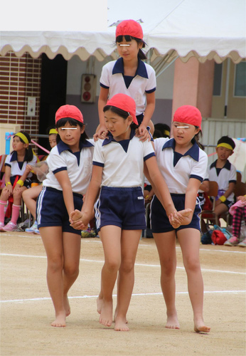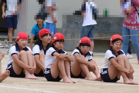 しっかりかぶった赤白帽とシャツイン徹底は