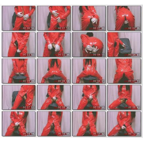 テラテラ光る赤いエナメルキャットスーツを着た男の娘がクロッチジッパーを開いてアナルにディルドを挿入。