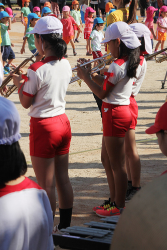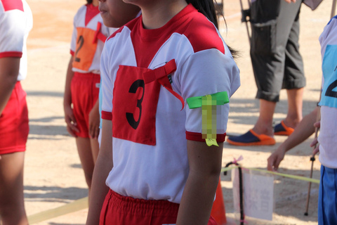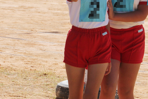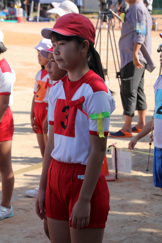 明るい紅色の単色短パン、開会式なのでしっかりシャツ入れにするように