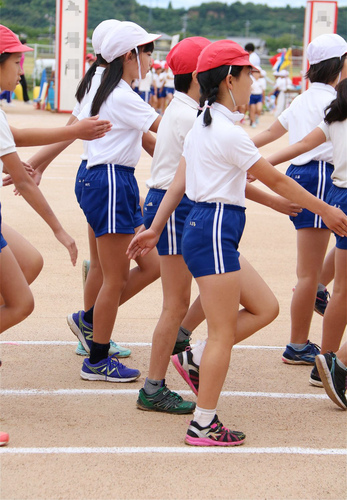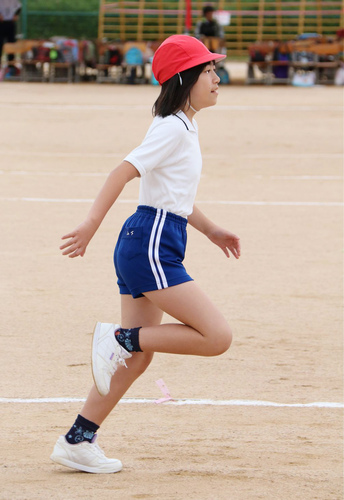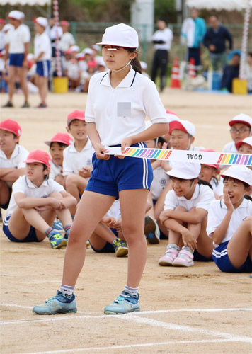 ゴールテープ係のややおませさん、藪にらみ顔に