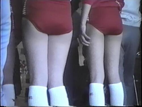 後半は学校の校庭にあるコートでの練習風景 ここではジャージ姿に紺色ブルマで練習 どうやって撮影したんだろか