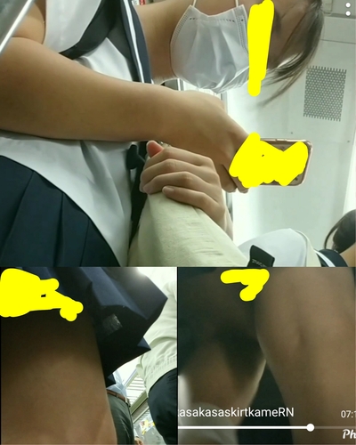 制服 セーラー服 逆さ エスカ逆さ 電車内亀入れ おっぱい リアルな膨らみ 太もも ノーも座 児P 笑顔で亀目線