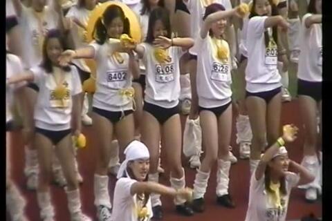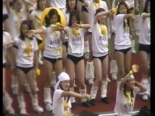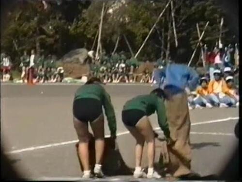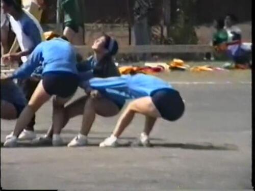 最後のおまけは、こちらも女子校のようですが、応援風景なのか閉会式なのか不明です みんなで肩を組んで左右に揺れながら何か歌ってる感じです 白の体操服に紺色ブルマというオーソドックスな組み合わせなんですが、みんなルーズソックスを合わせてる点です 本物のルーズソックスの子もいたり、ゴム抜きルーズの子もいたりしますが、ビニール袋のようなもので代用してる子もいるようです とにかく全員紺色ブルマにルーズソックスの組み合わせというのが最高です 相性抜群です Vラインのパンティのようなブルマから太ももが見え、ルーズソックスというなんかちょっぴりえっちですね