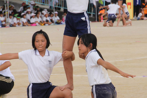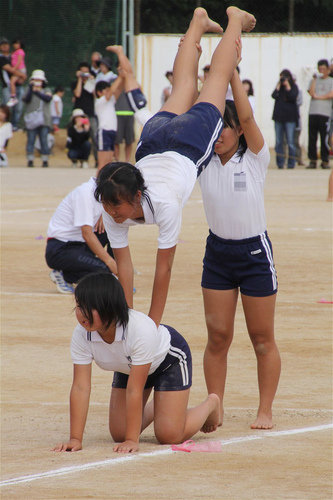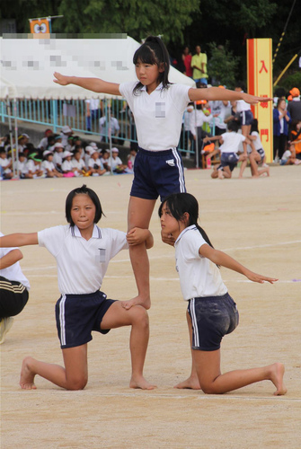 襟付き体操着のチームの組体操の様子。