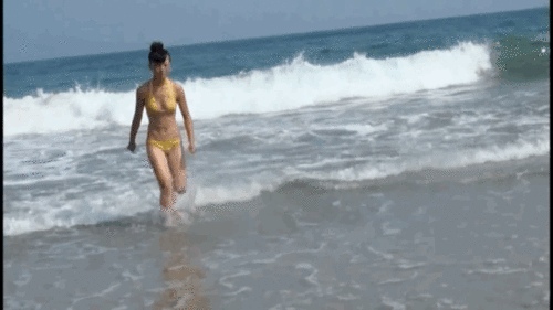 黄色ビキニが濡れると、くっきり見えちゃっています。