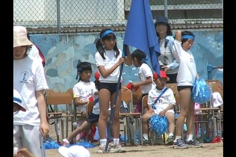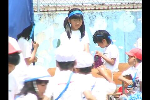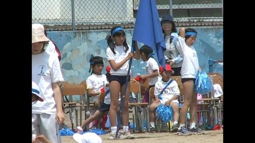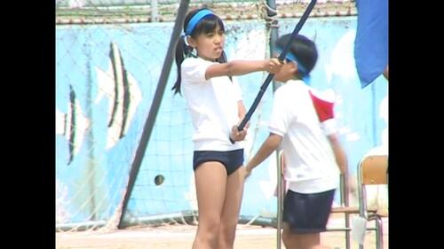 ジュニアアイドルブルマちゃんは、青色の旗をもって応援しています
