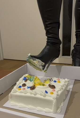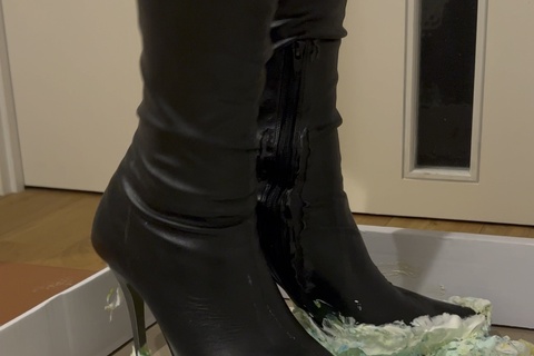 生クリームがたくさんの真っ白いケーキですが、踏み潰され、ブーツで練り込まれると最後はどんな色になってしまうのか、、、