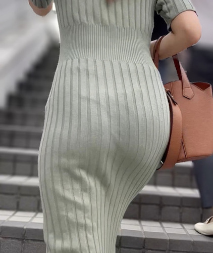 派手めな色合いのリブニットワンピースで出勤中のOL。