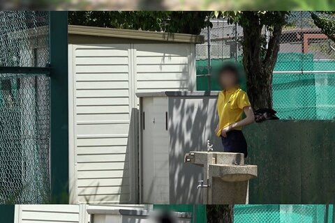 テニスコートから少し隠れた、物置の陰で着替えをしています