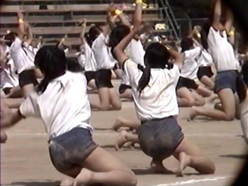 各学年ごとの女子だけのマスゲームがメイン映像です 砂まみれになるまで踊るんですが、ここまで相当な練習をしたであろうし、汗、砂だらけでブルマは毎日洗濯必須でしょう なんとなく使いこまれた、色褪せたブルマが多い印象です