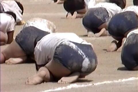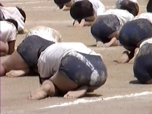 全体演技も体全体で表現してるのでしょう、天ぷらの衣をつけるように砂に転がりながら、唐揚げ粉でもいいですw 全身砂まみれ、ブルマも真っ白です 白いラインのところでは、石灰がブルマにたっぷりと 最近メッシー系の映像が人気のようですが、まさに天然のメッシー映像です ブルマ尻も真っ白 全員真っ白です