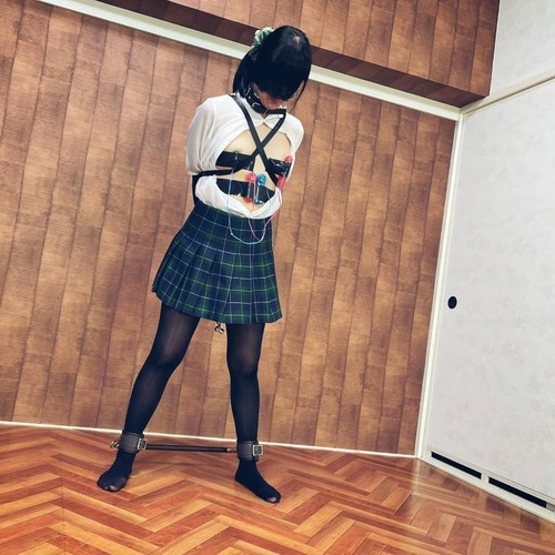 立ち姿で後ろ手にアームバインダーと、閉じられないように足枷。