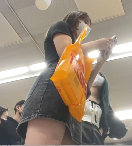 ホームで電車を待つお姉さんデニムスカートが少し浮き気味でスカート内も明るく撮れています。