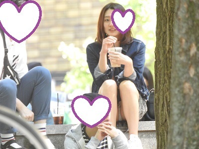石段に彼氏と一緒に座って、会話に夢中になっている綺麗な姉さんが、白のパンティーを見せていました!!