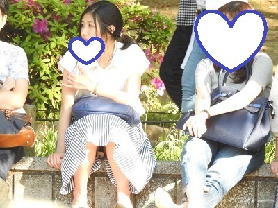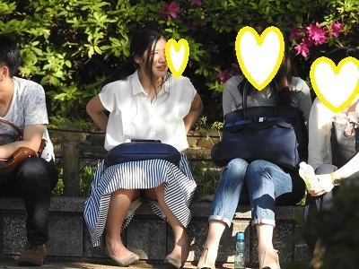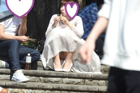 1人目・・・石段に彼氏と一緒に座っている可愛いお姉さんが、パンスト越しの白のパンティーを見せています。顔が可愛いので大興奮です!!