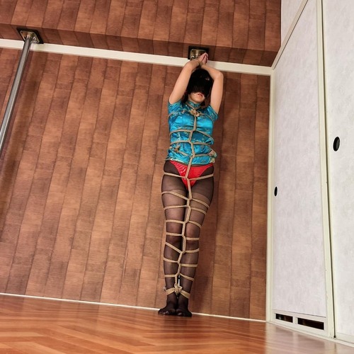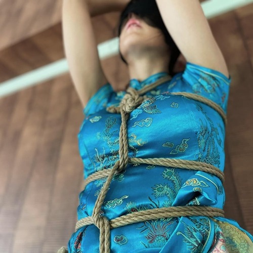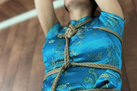 チャイナ服を着た女の子、腕を上げた状態で全身緊縛。