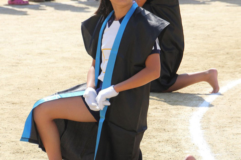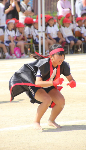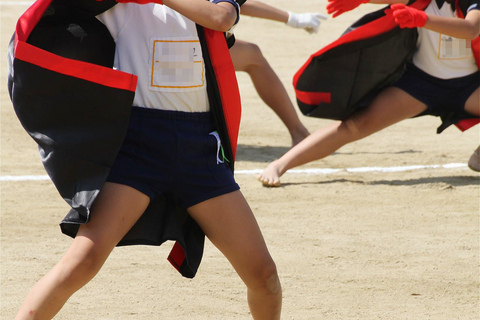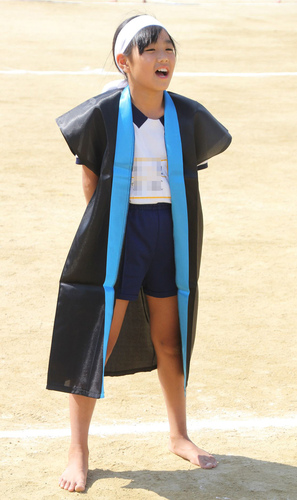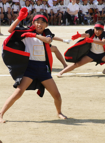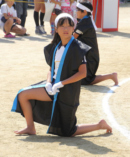 裸足に法被、鉢巻き姿もりりしくソーラン踊りに挑戦する