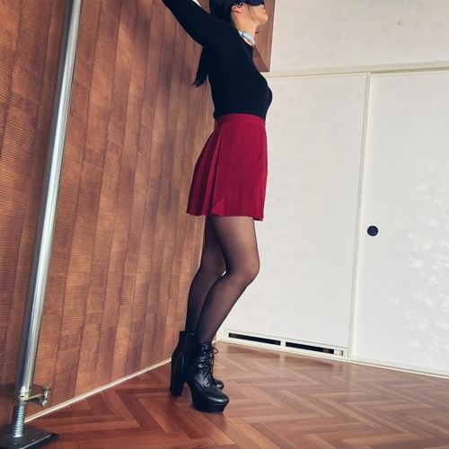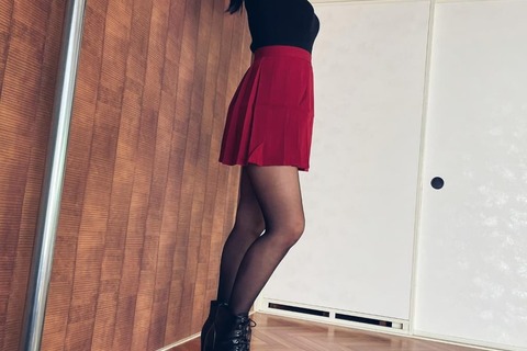 黒のトップスに赤のミニスカート。黒のストッキングと黒のブーツ。下着は白のTバック。