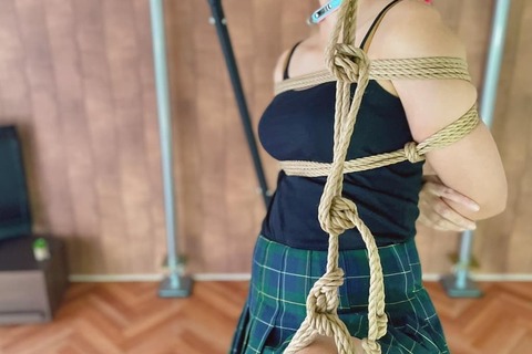 後ろ手縛りと片足吊り、その状態でバイブを挿入し股縄で固定。