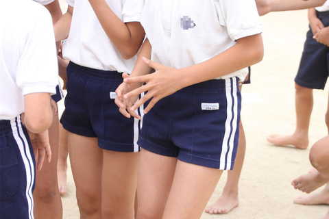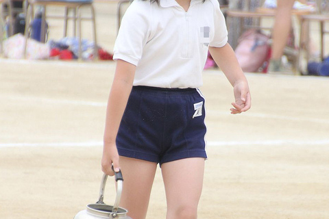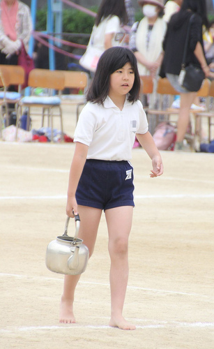 裸足でやかんを持ってグラウンドに並び線を付ける係娘、