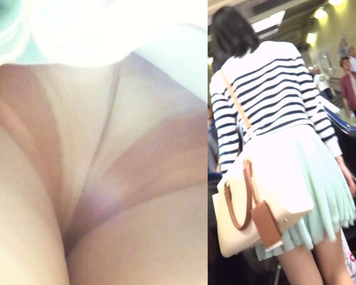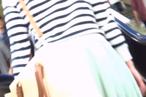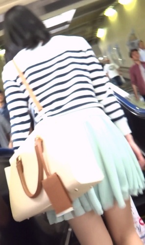 彼女は水色のフリフリな裾をしたミニスカートを履いていました。結構スカート丈が短かったので、うまくスカートの中へカメラを突っ込めばパンツが撮れそうな感じです。そこでカメラを準備して撮影を開始しました。こっそりと彼女の背後から近づいて行きます。