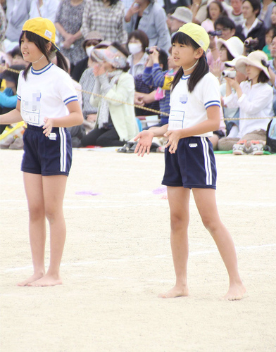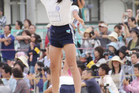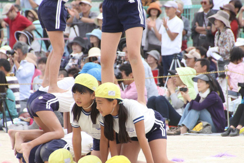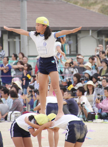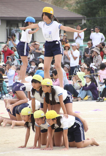 をつばの部分をさかさまにしてかぶって組体操をしていく独特の形態。