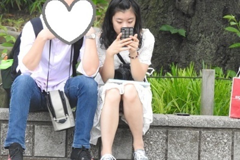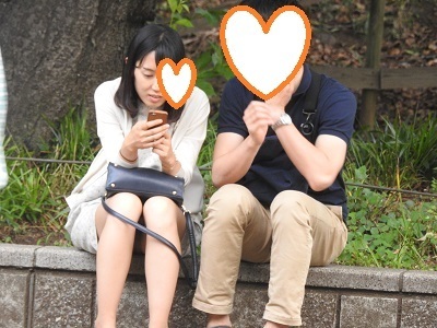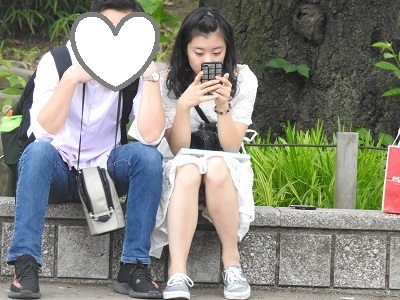 3人目・・・石椅子に座って彼氏とスマホゲームに夢中になっている綺麗なお姉さんが、白のパンティーを見せています。