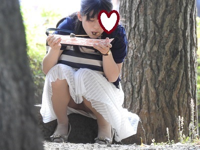 2人目・・・石椅子に彼氏と一緒に座っている綺麗なお姉さんが、スマホに夢中になり白系のパンティーを見せています。