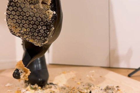 今回はお友達からもらった履き古しのロングブーツでお寿司を踏み潰してもらいました