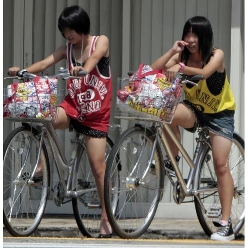 街で見かけた自転車に乗る姿…高く上がった腿など、美脚がいっそう際立ちます。長辺で3600ピクセルかそれ以上の高画質写真が約100枚。