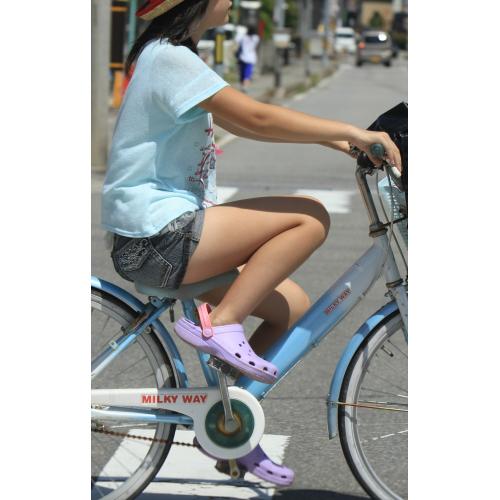 街で見かけた自転車に乗る姿…高く上がった腿など、美脚がいっそう際立ちます。長辺で3600ピクセルかそれ以上の高画質写真が約100枚。
