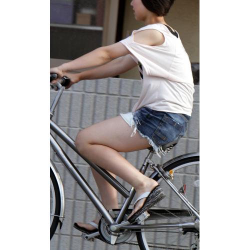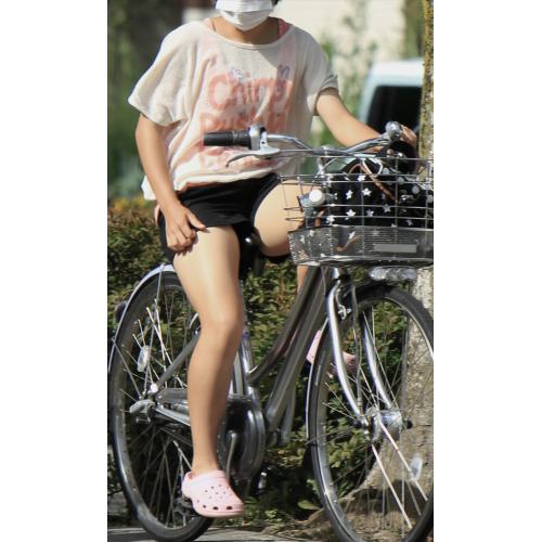 街で見かけた自転車に乗る姿…高く上がった腿など、美脚がいっそう際立ちます。長辺で3600ピクセルかそれ以上の高画質写真が約100枚。