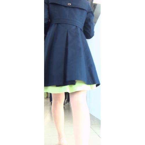 彼女は薄手のコートを着ていましたが丈は短めで、履いていた黄緑色のミニスカートと足が丸出しでした。これはパンツ撮れそうだなと思ったので、後ろから接近して行きます。
